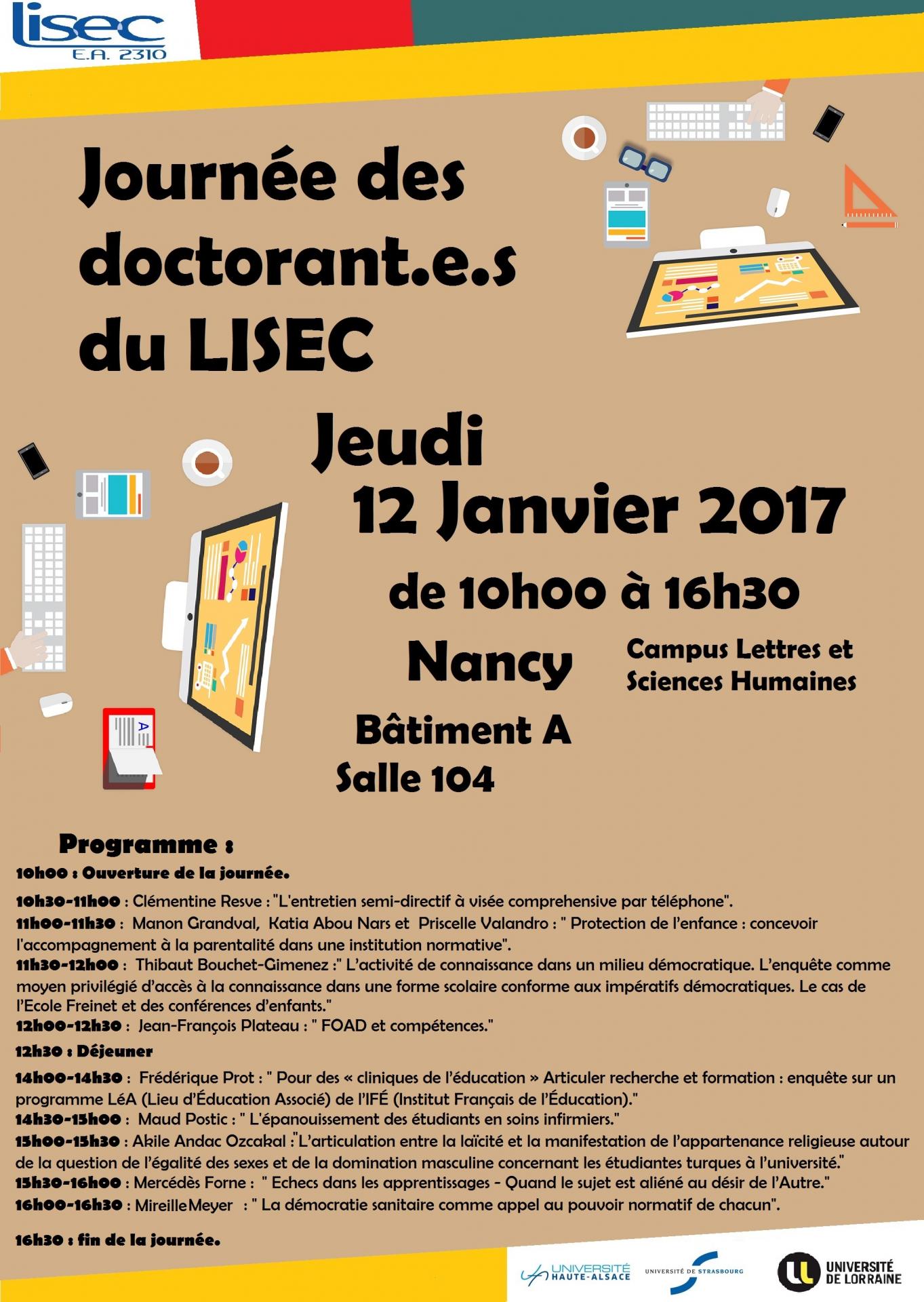 Une journée doctorale axée sur les questions méthodologiques est organisée par trois doctorantes du LISEC Lorraine (C. Resve, F. Prot et A. Milon), le 12 janvier prochain à Nancy.